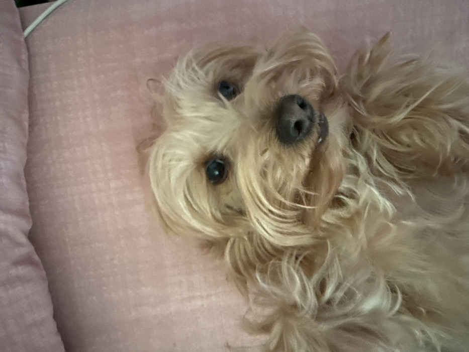 A light brown and blonde, shaggy-haired terrier-type dog is observed lying on its back, positioned centrally within the frame. The dog's head is slightly tilted, with its dark eyes looking directly forward. Its dark-colored nose is visible, and its mouth is slightly open, revealing small teeth. The dog's fur appears soft and somewhat dishevelled. The background consists entirely of a uniformly textured, light pink fabric surface, likely a blanket or bedding, which occupies the entire visible environment. No other subjects or objects are discernible. The scene takes place in Yambol, Bulgaria.