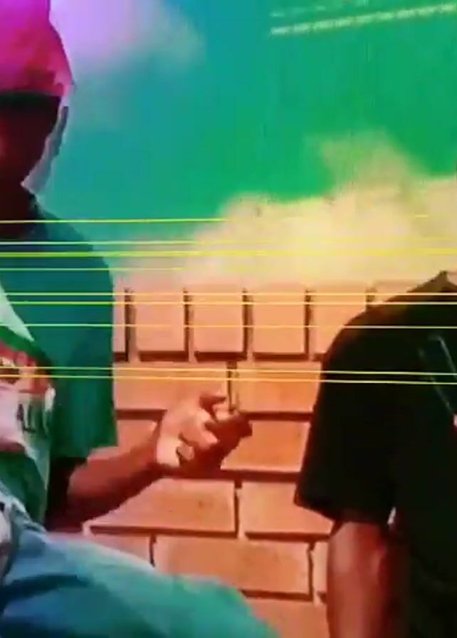 Two men are standing in front of a brick wall with a painted backdrop of green and blue. The man on the left wears a light green shirt, a pink hat, and has green marker on his face. He is holding his hands up to his head. The man on the right wears a black shirt with a design and is looking down. The screen then cuts to a child in a blue and white striped shirt, then to a child crying while holding a blue and white ball. The screen has horizontal yellow lines throughout.