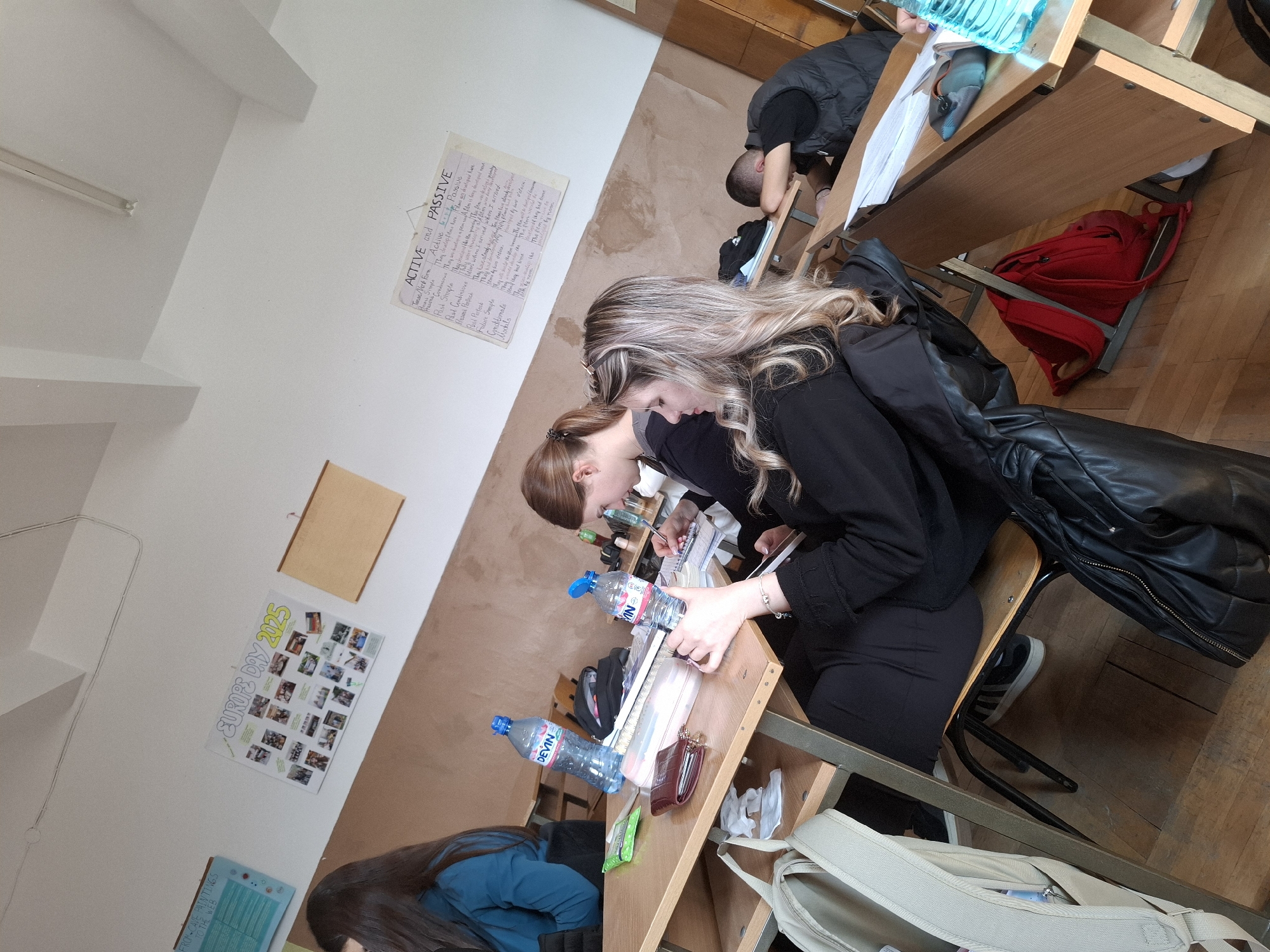 The image depicts the interior of a classroom in Panagyurishte, Bulgaria. The room features two-toned walls with a light brown lower section and a white upper section, a white ceiling with exposed beams and a fluorescent light fixture, and a wooden plank floor. Four individuals are visible, seated at individual wooden desks with metal frames. In the foreground, a female with long, wavy blonde and light brown hair, wearing a black top, is seated. She holds a smartphone or tablet in her left hand and a pen in her right, appearing to write in a notebook on her desk. A red wallet, white tissues, and a beige backpack are visible near her desk. A black jacket is draped over her chair. Adjacent to her, a female with brown hair, wearing a black long-sleeved top, is focused on writing in a notebook. A bottle of DEVIN branded water is on her desk. Further left in the midground, the back of a female with dark hair, wearing a blue top, is partially visible. In the background to the right, a male individual wearing a dark vest over a dark shirt is seated at a desk with his head resting forward on the desk surface, appearing to be sleeping or resting. Posters are affixed to the white wall sections. On the left, a white poster titled "EUROPE DAY 2025" displays a collage of photographs and a small Bulgarian flag. Below it, a blue poster titled "FROM CAVE PAINTINGS TO THE WEB" is partially visible. On the right, a white poster titled "ACTIVE and PASSIVE" contains handwritten text outlining English grammar tenses. Several DEVIN brand water bottles, notebooks, and other school supplies are present on the desks. Red and black backpacks are visible on the floor beneath the desks.