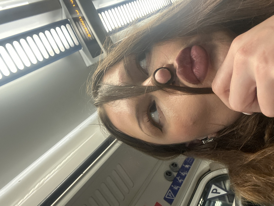A young woman with brown hair poses in an indoor setting, possibly a train or bus. She looks upward with light eyes, a strand of her hair curled around her finger near her lips. The background includes linear lights and ventilation panels along with signage with symbols. Her lips are painted in lipstick. She has a pierced earring on her left ear.