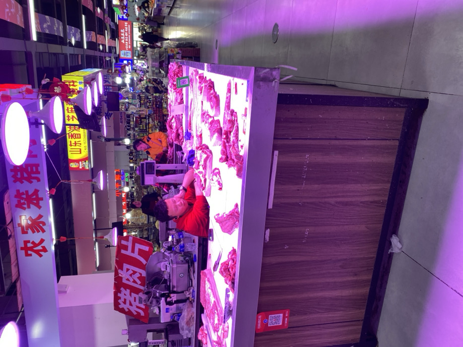 An indoor market scene shows a brightly lit meat counter displaying various cuts of raw meat. Two individuals work behind the counter. One is slicing meat using a machine. A red sign reads "pork slices" in Chinese. Overhead lighting illuminates the scene, and shoppers can be seen in the background, browsing the market's offerings. The scene appears to be a bustling and active market environment.