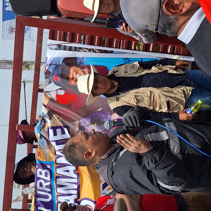 The scene captures an outdoor public gathering in Miraflores, Peru, under daylight conditions with an overcast sky. In the central foreground, a man with dark hair, dressed in a black jacket with grey reflective strips and black gloves, speaks into a silver microphone connected by a blue cable, while gesturing with his raised, gloved right hand. To his immediate right stands another man wearing a light-colored straw cowboy hat, a dark shirt, and a beige multi-pocketed utility vest, holding a green-capped plastic bottle with yellow liquid. Behind these two, a large banner displays partial text, "Y URB." and "CAMANTE," alongside a stylized illustration and a photographic image of a smiling woman wearing a red hat. Above this banner, two women in hats observe from behind a dark red metal frame, likely part of a truck bed. On the far right, a partially visible individual in a light-colored straw cowboy hat holds a smartphone, apparently recording. The back of a man's head, wearing a grey cap, is visible in the lower right foreground. Distant utility poles and additional banners are faintly visible in the background.