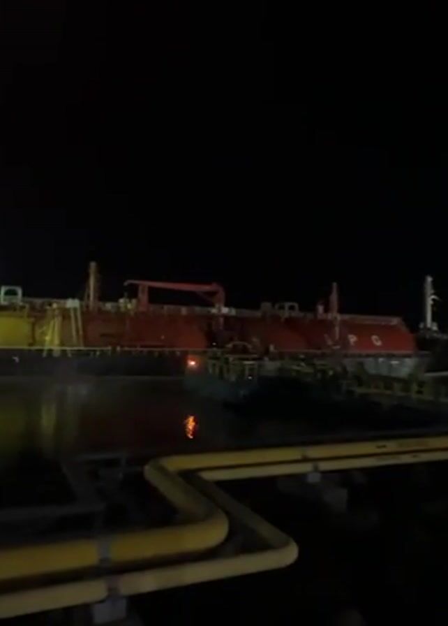 The scene is a night shot of two ships docked at what appears to be an industrial port. In the foreground, yellow pipes run along what may be a pier or loading platform. The ship on the left is white with a black hull and illuminated windows, and it features a tall communications tower. Adjacent to it, the second ship is red and yellow, with the letters LPG visibly printed on the side. The water reflects the lights, and the darkness of the night sky contrasts with the artificial light. The stillness of the water suggests calm conditions.