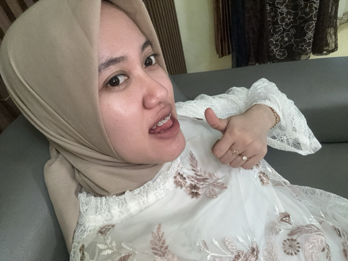 The image depicts a female subject from the waist up, positioned indoors, likely in a residential setting within Gadingrejo, Indonesia