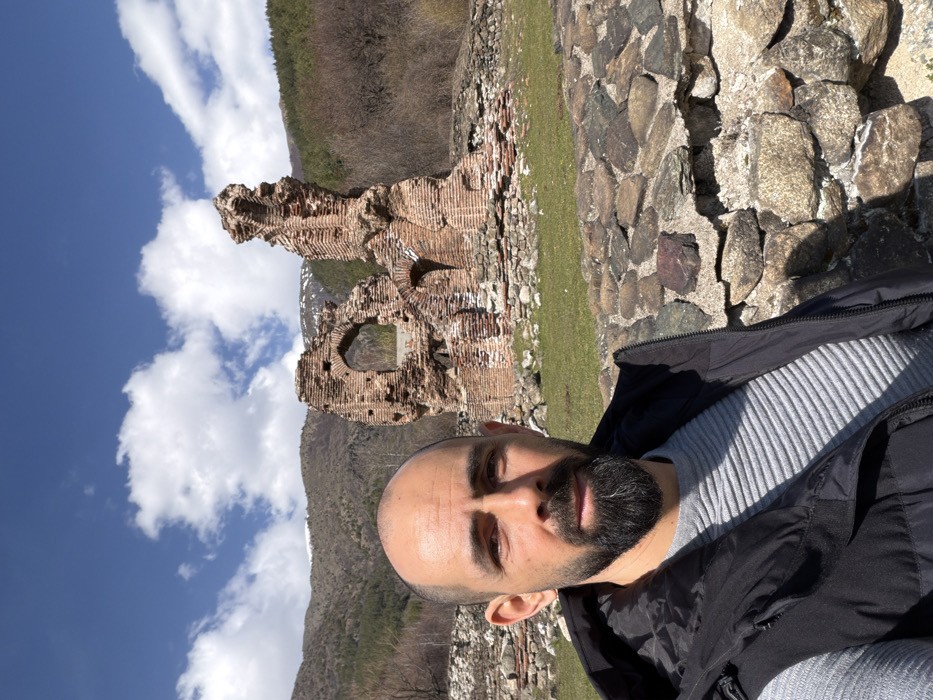 An adult male, appearing in his mid-30s to 40s, is captured in a direct portrait. He has a bald head, a dark, grey-flecked beard, and is wearing a grey ribbed long-sleeved shirt underneath a black puffer vest. He maintains a neutral expression, gazing directly forward. The subject is positioned in the midground, with a historical ruin immediately behind him. This structure is identifiable as the Elenska Basilica ruins, located near Pirdop, Bulgaria. The ruins consist of significantly decayed red brick walls, featuring prominent arched openings and fragmented structural elements. The ground surrounding the ruins is covered in green grass. In the background, a range of forested mountains rises. Higher elevations of these mountains display patches of snow. The lower slopes show a mix of evergreen and deciduous trees. The sky is bright blue with scattered white cumulus clouds. A low wall composed of irregular, multi-colored stones is visible in the lower right foreground. The scene is illuminated by natural sunlight.