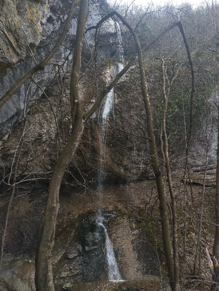 The image displays a natural landscape featuring a waterfall cascading down a rocky cliff face within the area of Veselinovo, Bulgaria. A prominent, narrow stream of white water descends vertically from an unseen source at the upper portion of a steep, stratified rock wall. The rock face is composed of varied grey and brown tones, exhibiting visible layers, fissures, and some areas with dark mineral staining or moss. Several bare deciduous tree trunks and branches occupy the foreground and midground, framing the waterfall. A thick, dark tree trunk is positioned on the left side of the frame, extending from bottom to top, with another similar trunk on the right. Numerous thinner, gnarled branches, devoid of leaves, crisscross the upper and central portions of the scene, suggesting a late winter or early spring season. The base of the waterfall shows a collection of rocks and accumulated organic debris. The scene is illuminated by diffused natural light. No human or animal subjects are present.