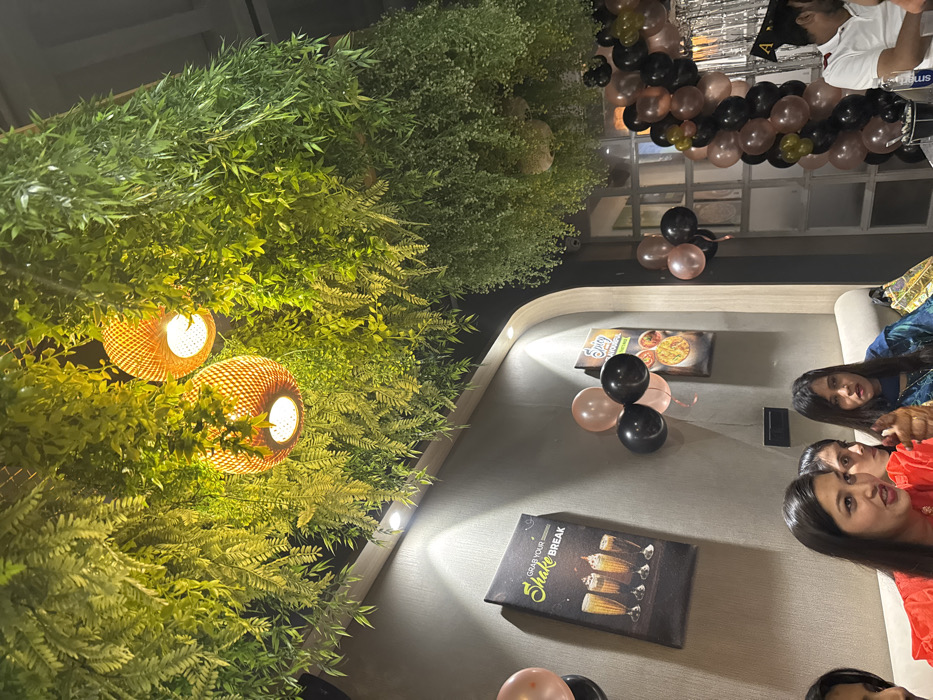 A restaurant space decorated with lush greenery and round, woven light fixtures. Black and rose gold balloons adorn the ceiling. A table holds two menu cards and some balloons. Several people are gathered near a white couch, looking toward the camera.