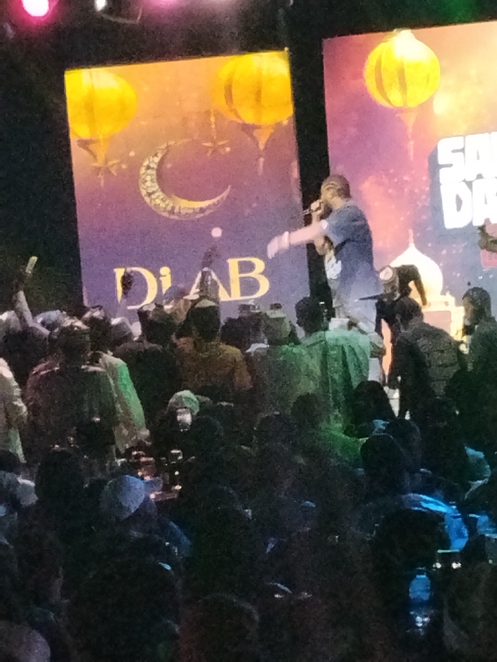 The image captures an indoor musical performance or event taking place at night in Fagge D2, Nigeria. A male performer, wearing a dark short-sleeved top and dark glasses, stands on a stage, slightly right of center. He holds a microphone in his raised left hand and extends his right arm to the left. Behind him, two large illuminated screens act as a backdrop. The left screen exhibits an orange-to-purple gradient, featuring two yellow ornate lanterns, a crescent moon graphic, and the text "D'iAB" at the bottom. The right screen, partially visible, displays white text appearing as "SOUND DAB" (or similar) and a white decorative structure resembling a mosque dome. A dense crowd of individuals occupies the foreground and midground, mostly silhouetted, with some highlighted by green and blue stage lighting. Numerous audience members are oriented towards the stage, with some raising their hands and others holding up mobile phones. Small tables with visible bottles or drinks are situated among the audience in the lower foreground. The environment is dimly lit, with primary illumination emanating from the stage and screens.
