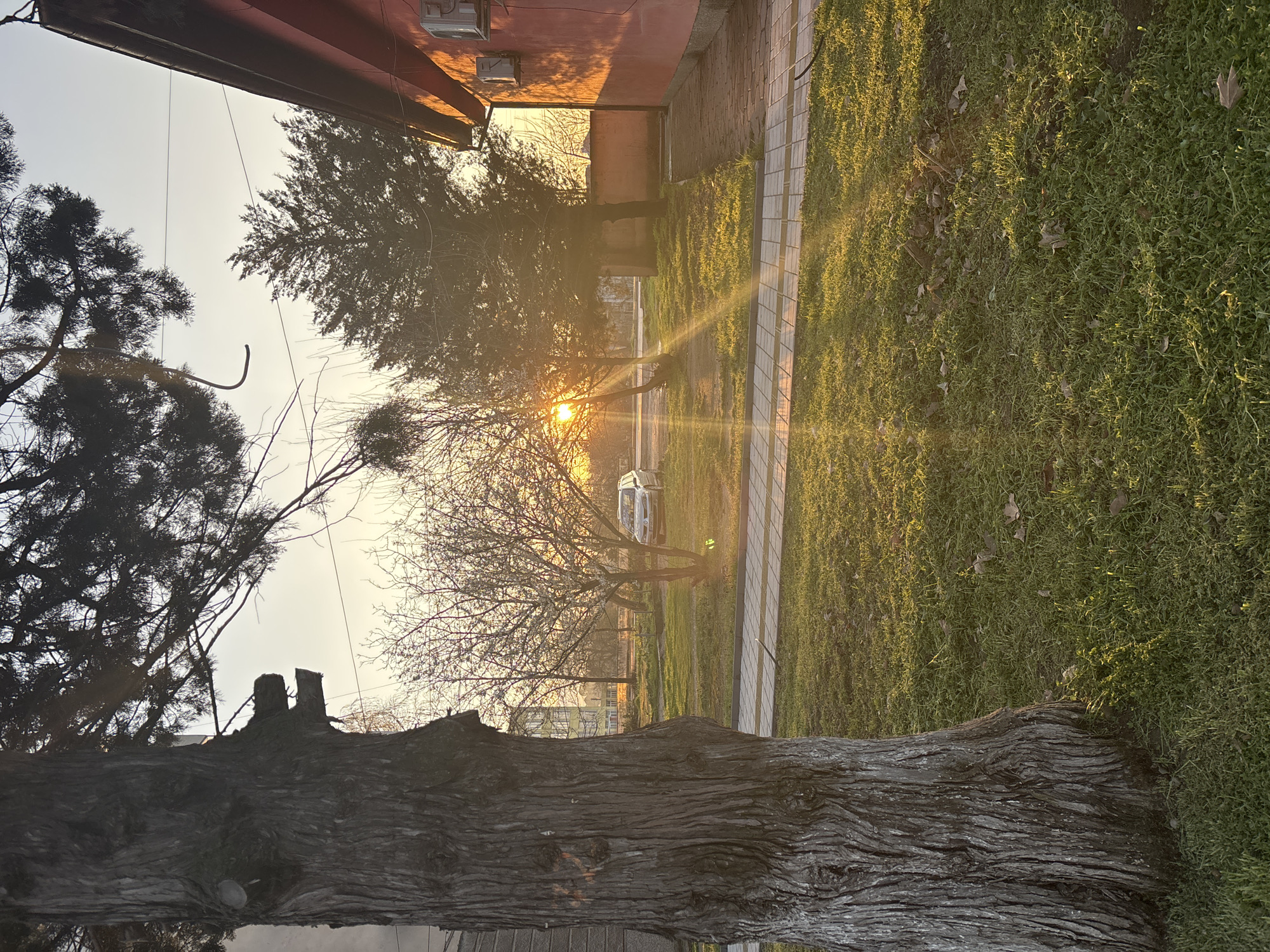 The image, potentially captured in Mizia, Bulgaria, shows a sunlit scene along a paved walkway flanked by grass. A red-painted building stands on the left side of the frame. A car is partially visible between the bare branches of a tree where the sun is peaking through. In the foreground, the rough bark of a tree trunk dominates the bottom portion of the image. The sky is a pale, faded color, indicative of either early morning or late afternoon.
