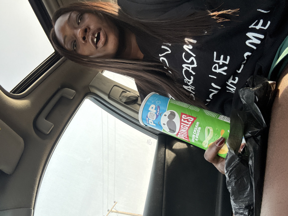 The scene depicts the interior of a vehicle, located in the city of Lugbe, Nigeria. A single adult female is positioned in what appears to be the passenger seat. She has dark skin, long, straight dark hair with lighter streaks, and is looking forward with her mouth slightly open, revealing a gap between her two upper front teeth. She wears a black t-shirt with partially visible white text reading "...SARCASM. YOU'RE WE_COME." Her right hand, adorned with dark red nail polish, holds a green "Sour Cream & Onion" Pringles can vertically. A crumpled black plastic bag rests on her lap, partially obscuring her lower body. The vehicle's tan overhead console, passenger grab handle, and an open sunroof are visible. Through the left-side car window, a hazy bright sky and distant utility poles with power lines are discernible, indicating an outdoor, likely urban or semi-urban environment.