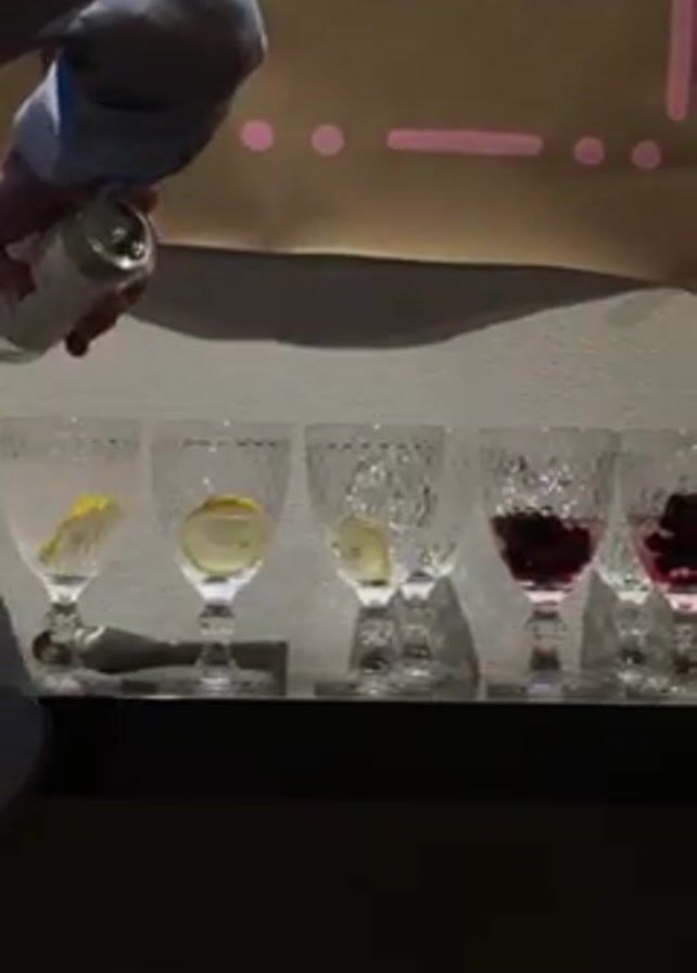 A person wearing a light blue long sleeve shirt and gray sweatpants is pouring a clear liquid from a white container into a row of crystal glasses. Three glasses on the left contain slices of lemon and the two on the right contain blackberries. The glasses are sitting on a black surface. A piece of brown paper hangs on the wall behind the glasses, decorated with pink shapes and dots. Music plays in the background.