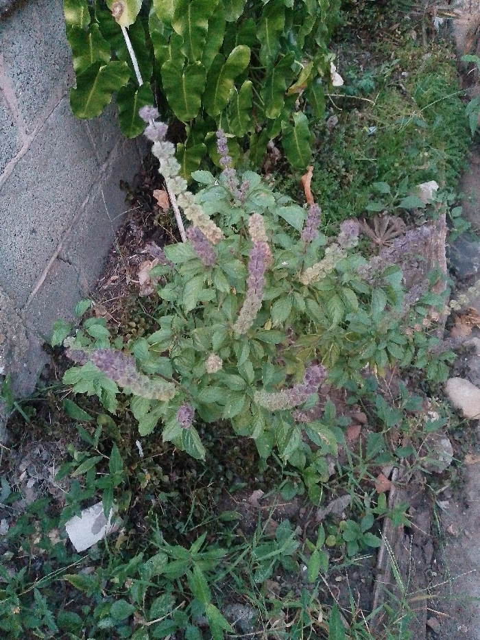 A lush Thai basil plant bursts with green leaves and spiky purple flower stalks. It grows beside a weathered concrete wall and a patch of broadleaf plants. Smaller weeds and grasses surround the herb, scattered amidst gravel and dirt. A small piece of white trash is visible at the base, adding a touch of human influence to the natural scene.