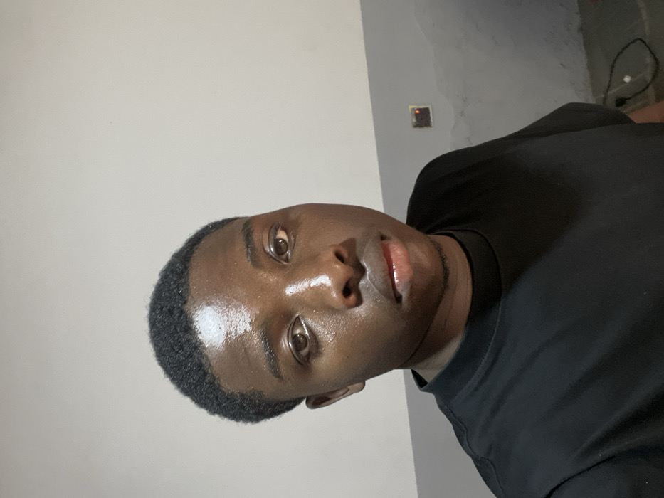 An indoor headshot-style portrait features a young male subject with dark skin, short, dark, closely-cropped hair, and a neutral expression, looking directly at the camera