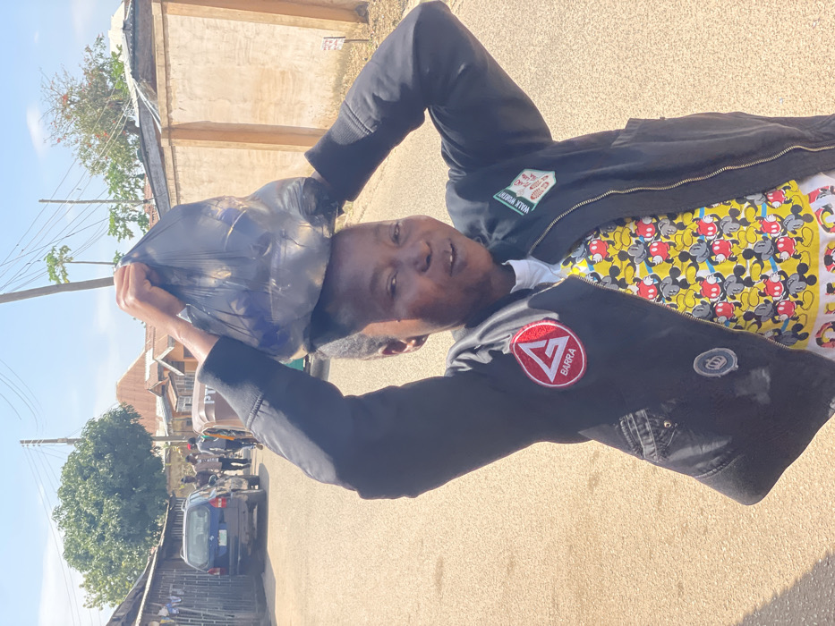 This image captures a street scene in Jos, Nigeria, on a clear, sunny day. The central figure is an adult female, positioned in the foreground and looking directly towards the camera with a slight smile. She has short, dark hair and is wearing a black bomber jacket over a yellow and white t-shirt patterned with multiple Mickey Mouse heads. The jacket has a red and white triangular patch with "BARRA" text on the left arm, a "WALK WORRY" patch on the right chest, and a silver crown emblem on the left chest. She is balancing a black plastic bag, which appears full, on her head, supporting it with her raised hands and bent arms. The background reveals a paved road extending into the distance. On the left side, a blue station wagon or SUV is parked facing away from the camera. Further down the road, a small group of individuals is visible walking away from the viewer. On the right, a light-colored concrete wall runs parallel to the street, featuring a small, unreadable white sign. Various buildings with corrugated metal roofs and scattered trees, including a large leafy tree and a slender palm-like tree, line the street. Overhead, power lines are visible against the bright blue sky. A partial view of a three-wheeled vehicle is discernible in the mid-ground on the right.