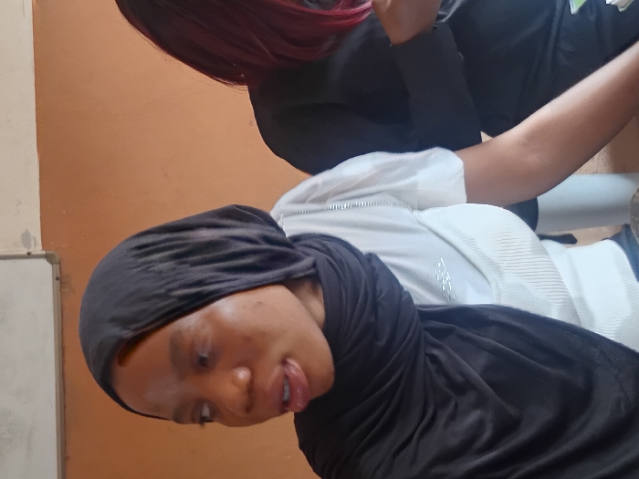An indoor scene in Ayangba, Nigeria, depicts two individuals. In the foreground, a light-skinned female with a black head covering and a white ribbed short-sleeved top with embellishments on the chest looks towards the left, her mouth slightly open with her tongue visible. Her right arm is partially visible below the elbow. To her right, a second female is partially visible, wearing a black top and exhibiting red-dyed hair. The background consists of an orange-brown wall and a white board partially visible in the upper left corner. A white vertical object, possibly a chair back or column, is seen behind the first female.