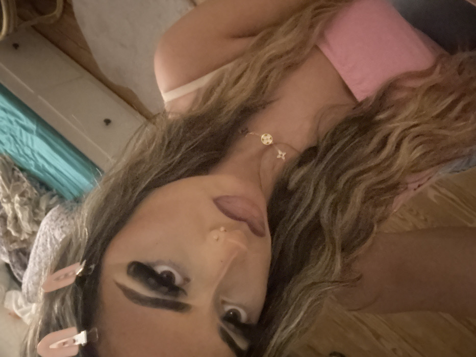 A woman with blonde, wavy hair poses for a selfie. Her dark eye makeup contrasts with her fair skin. Pink hair clips adorn her hair. She wears a pink top and a delicate gold necklace. Her nose is pierced, and her lips are painted with a muted shade. The background features a mix of textures, including bedding and what appears to be a cushioned headboard or side table. The overall image has a casual, personal feel.