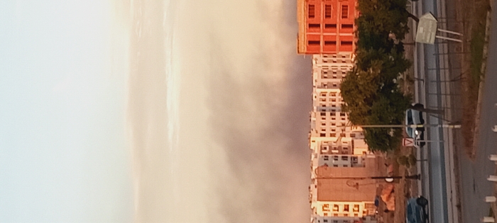 The image depicts an urban landscape in Fez, Morocco, viewed from an elevated perspective under conditions suggesting either dawn or dusk. A significant, dark grey smoke plume dominates the central sky, spreading horizontally and obscuring portions of the background horizon, tinging the surrounding atmosphere with warm yellowish-orange hues. In the mid-ground, a cluster of multi-story, light-colored buildings, possibly residential, features numerous windows and a uniform architectural style. To the far right, a distinct red-painted or brick building with multiple window openings stands partially constructed or recently completed, contrasting sharply with the lighter structures. The foreground is bisected by a multi-lane road, likely a divided highway, with a visible median strip. A dark-colored SUV is observed traveling left in the far lane, while a white SUV travels right in a closer lane. A white and red "V" shaped traffic sign is visible near the white SUV. Green-leafed trees and smaller bushes are interspersed along the road and median. A tall, dark street lamp post stands on the left. On the right, a white and green directional sign is partially visible behind a dark metal fence. The ground adjacent to the road appears undeveloped or under construction, characterized by bare earth and some light-colored rubble. No individuals are discernible within the frame.