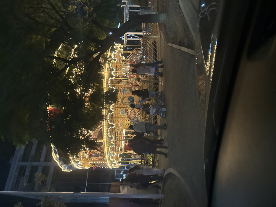 A carousel with many lights glows warmly in the night, surrounded by trees and a few buildings. People stand around the carousel, some with strollers. The view is partially obstructed by the edge of a car window on the right side of the frame. The overall scene has a festive and lively atmosphere.