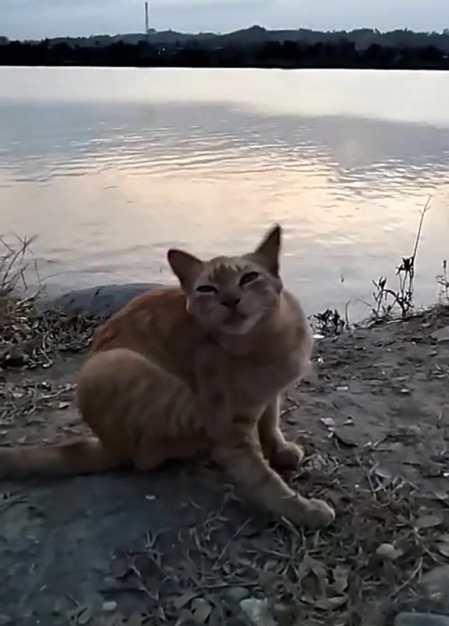 n orange tabby cat sitting by a body of water. The cat scratches its head with its hind leg. In the background is the body of water, hills, and a tall structure. The sky is overcast. The ground is rocky with some grass and leaves. A person off-camera meows at the cat.