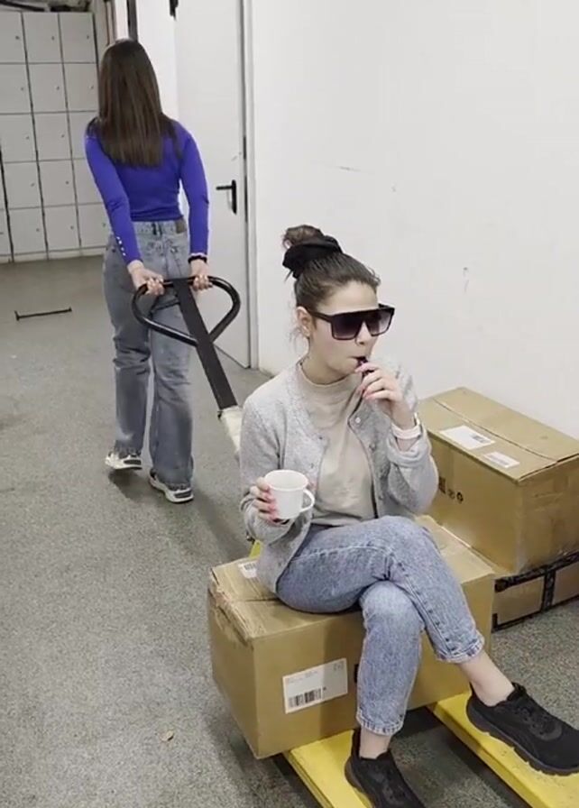 Two women are in a utilitarian indoor space that appears to be an office or storage area. The walls are white, and the floor is a speckled gray. Against one wall are several gray storage lockers, and there is a white door with black hardware. One woman, wearing a blue long-sleeved shirt and jeans, is pulling a yellow pallet jack. On the pallet jack are several stacked cardboard boxes. The second woman is sitting on top of the stack of boxes. She is wearing light wash jeans, a gray cardigan, sunglasses, and black sneakers. Her hair is up in a bun. She is holding a small white cup in one hand and a vaping device in the other, which she is actively using. The woman pulling the pallet jack is facing away from the camera, and the woman on the boxes is facing forward, maintaining her position as she is pulled.