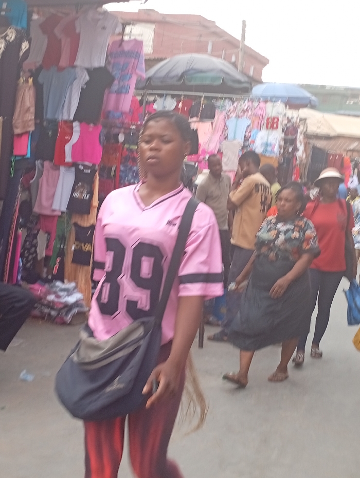 This image depicts a bustling outdoor market scene in the city of Nkwelle, Nigeria. In the foreground, a young adult female with a dark complexion walks forward, slightly blurred due to motion. She wears a pink short-sleeved V-neck shirt with black stripes on the sleeves and a prominent black number "39" on the front, paired with red and black patterned leggings. A dark blue and grey messenger bag is slung over her left shoulder, and long, light-colored hair extensions are visible trailing down her right side. Behind her, to the right, an adult female walks, dressed in a dark floral short-sleeved top and a dark skirt, wearing light-colored flat sandals. Further back, another adult female is visible, wearing a red top, dark pants, and a light-colored wide-brimmed hat. Several other individuals, mostly adult males in casual attire, are present in the background, moving or standing among market stalls. The environment features multiple market stalls with clothing displays. To the immediate left and behind the foreground subject, a vertical rack is packed with various women's tops, including t-shirts and tank tops in colors like pink, white, black, red, and blue. Additional clothing is visible on racks and in piles throughout the scene. Dark awnings or large umbrellas cover some of the stalls. The ground is paved, and reddish-brown building facades are visible in the upper background. The lighting is diffused, suggesting an overcast day.