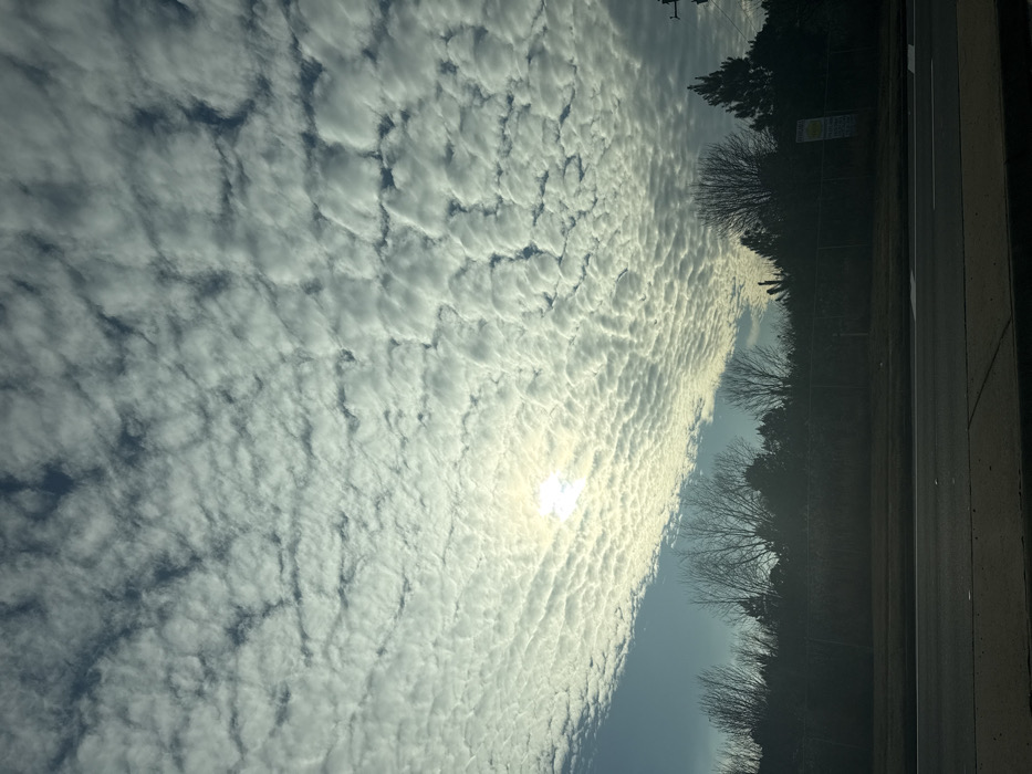 A breathtaking display of altocumulus clouds blankets the sky, creating a rippling, textured effect. The sun peeks through the cloud cover, casting a bright glow. The edge of a road runs along the bottom of the image, with trees standing as a dark, silhouetted border. The landscape transitions from urban to natural, highlighting the vastness of the sky.