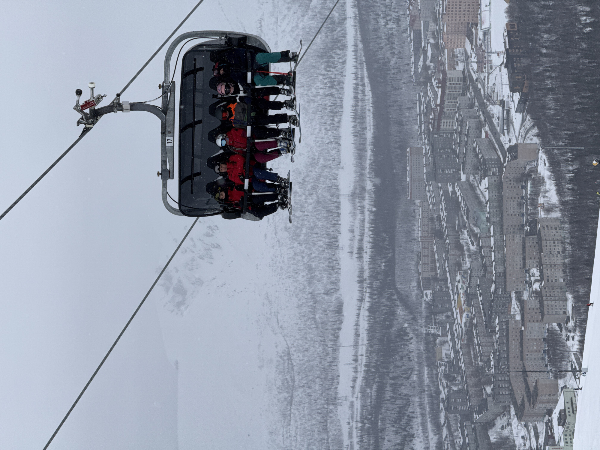 A chairlift gondola, marked "17," transports six individuals uphill over a snow-covered landscape in Kirovsk, Russia