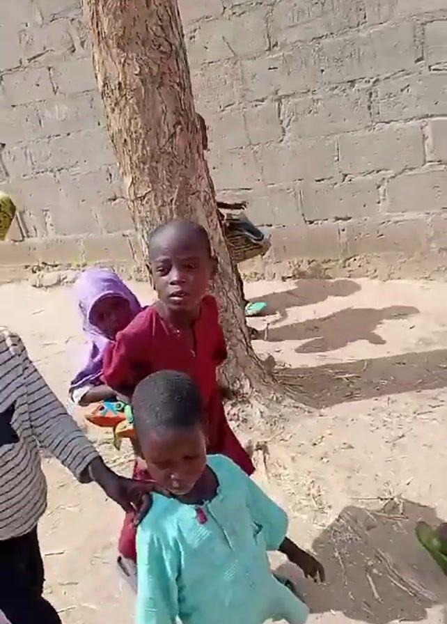 A group of children are walking along a dirt path next to a light-colored brick wall. Most of them are wearing casual clothes and sandals. One child is carrying a wrapped item on their head, another is carrying sandals. The children are walking together. There is a tree with a large trunk nearby. The lighting suggests it is daytime.