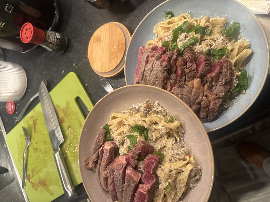 The image displays a domestic kitchen countertop, presumably located in Eindhoven, Netherlands, featuring two prepared plates of food and cooking remnants. Two servings of tagliatelle pasta, presented in a creamy sauce with visible mushroom pieces, are topped with finely grated cheese and fresh basil leaves. Slices of medium-rare to rare steak, exhibiting pink-red centers, are arranged over the pasta on both plates. The plate in the foreground has a light grey/beige rim, while the plate partially visible on the right has a blue rim. To the upper left, a bright green plastic cutting board, stained with reddish-brown residue consistent with meat juices, holds a silver chef's knife and a silver fork. In the background, on the dark, speckled countertop, a clear, ribbed glass salt cellar is visible alongside a small glass spice grinder with a red cap, labeled "ZWARTE PEPER" (black pepper). A round, light-colored wooden lid rests on the counter between the food plates and the spice containers. The scene indicates a recently prepared meal.