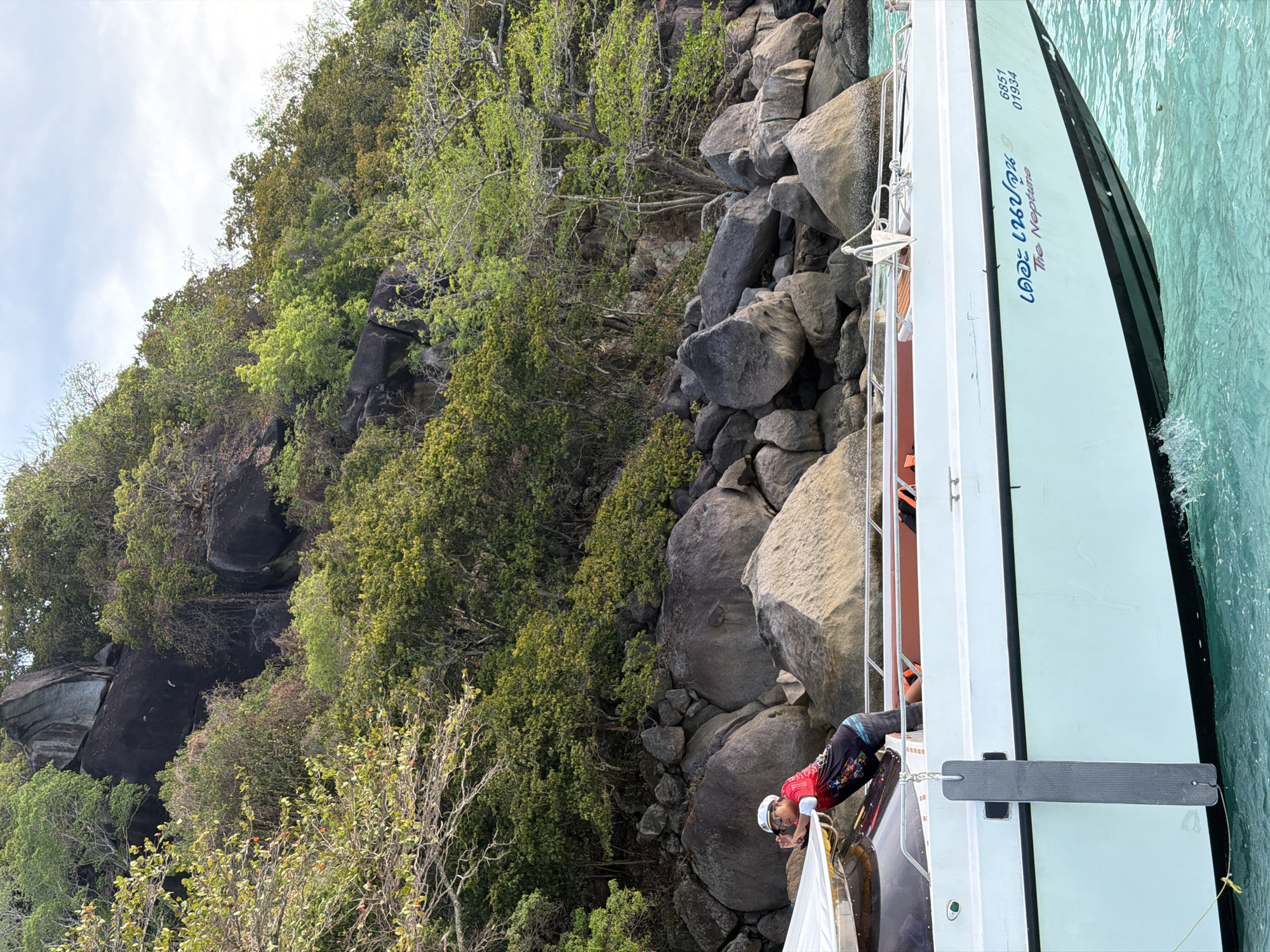 The image depicts a white speed boat, identified as "The Neptune" (เดอะ เนปจูน) with registration "6851 01934", in clear turquoise water near a rocky, heavily vegetated coastline. An adult male is situated on the bow of the boat, leaning forward with his left arm on the boat's white canopy and his right hand near his face. He is wearing a white cap, dark sunglasses, a red and black graphic short-sleeved shirt, and patterned shorts. A dark grey vertical fender is attached to the port side of the boat. The background features large, dark grey boulders stacked along the shore, densely covered with varied green tropical foliage. The sky is partly cloudy. The scene is consistent with an island or coastal area in the Andaman Sea region of Thailand.