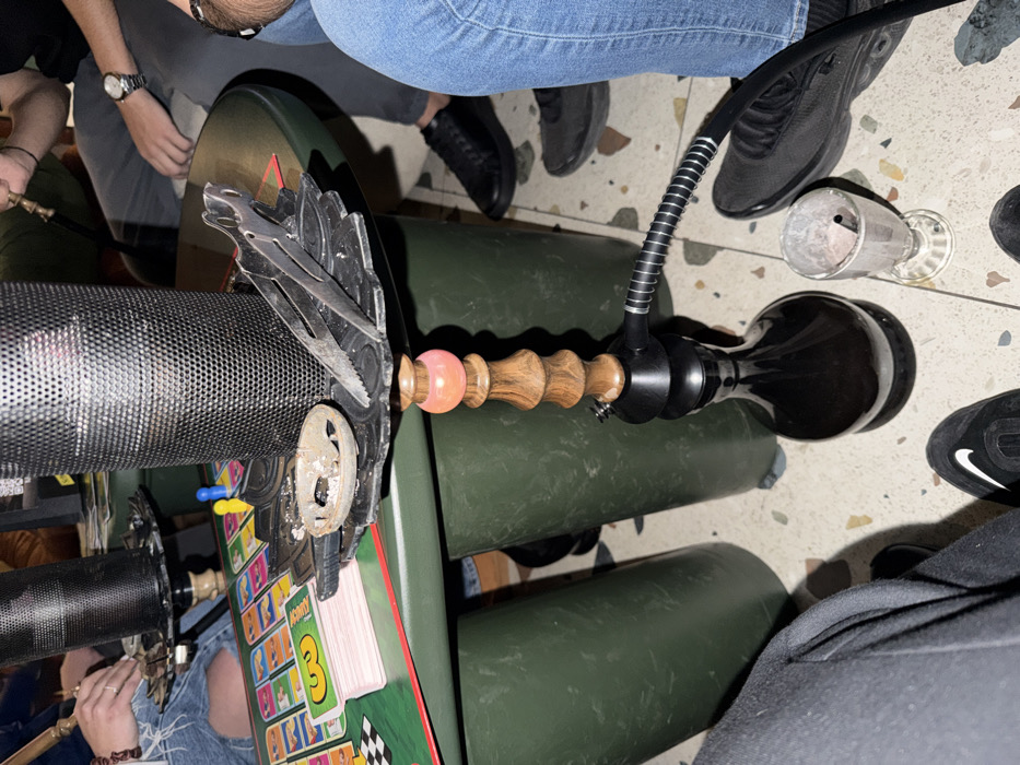An indoor scene in Sofia, Bulgaria, depicts a social gathering around a dark green, round table with thick cylindrical legs. A black and wooden hookah with a black glass base, a wooden stem featuring a pink bead, and a black perforated metal top stands on the light-colored terrazzo flooring. The hookah's top tray holds a small, round metal ash catcher containing ash and burnt charcoal pieces, alongside a pair of metal hookah tongs. A black hose with a metal spring coil extends from the hookah base. On the table, an "Activity" board game is displayed, showing colorful squares and a stack of three pink cards labeled "3". Two game pawns, one blue and one yellow, are positioned on the board. A stack of red cards is also visible. At least four individuals are partially visible. To the left, a person wears blue ripped jeans and a ring on their left hand. Another individual, top right, wears grey trousers and a watch on their left wrist, holding a black hookah hose with their right hand. The lower right portion shows a person wearing blue jeans and black sneakers. In the lower left, a person wears black trousers and black sneakers with a white Nike swoosh. A clear, stemmed glass, mostly empty with a straw inside, rests on the floor next to the hookah base. The environment is dimly lit.