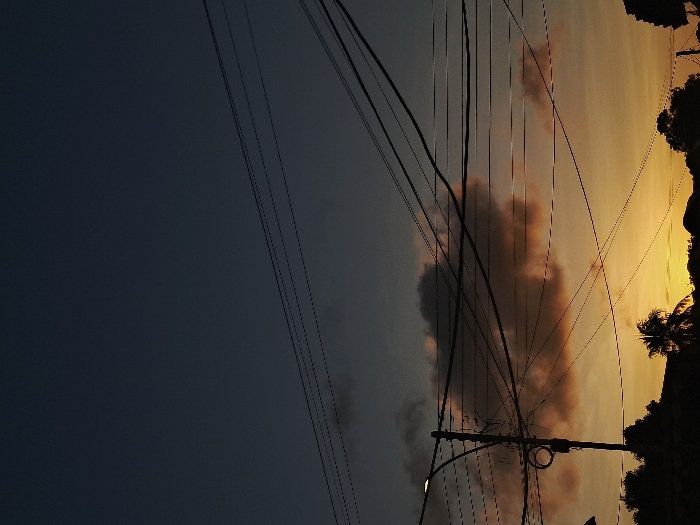 Silhouetted trees and a palm frame a warm sunset sky streaked with orange and yellow hues. Dark, ominous clouds bisect the scene, contrasting with the colorful sky. A dense network of power lines and a utility pole dominate the composition. The left side of the image is a dark blue, providing stark contrast to the illuminated right.