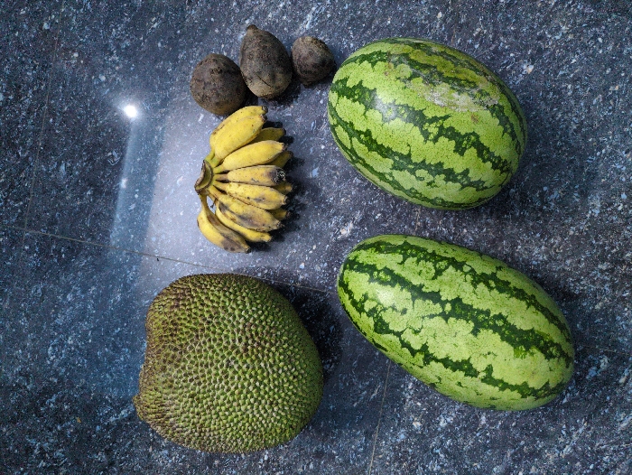 An overhead shot depicts a collection of fruits and tubers arranged on a dark, mottled tiled surface in Tiruvannamalai, India