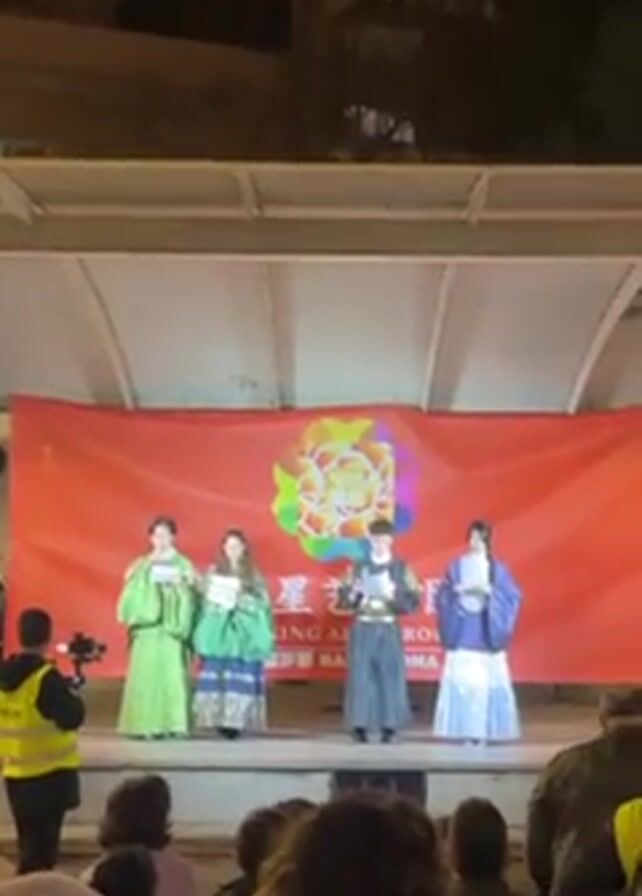 Four people are standing on an outdoor stage under a white awning. Behind them is a red banner with Chinese writing and an image of a flower. The individuals are dressed in what appear to be traditional Chinese garments. All four hold pieces of paper in their hands, and the person in the center appears to be reading from the paper. A small crowd of people is standing in front of the stage watching. A man in a yellow safety vest is standing to the left of the stage, holding a camera. The event seems to be taking place at night. The location appears to be an urban area.