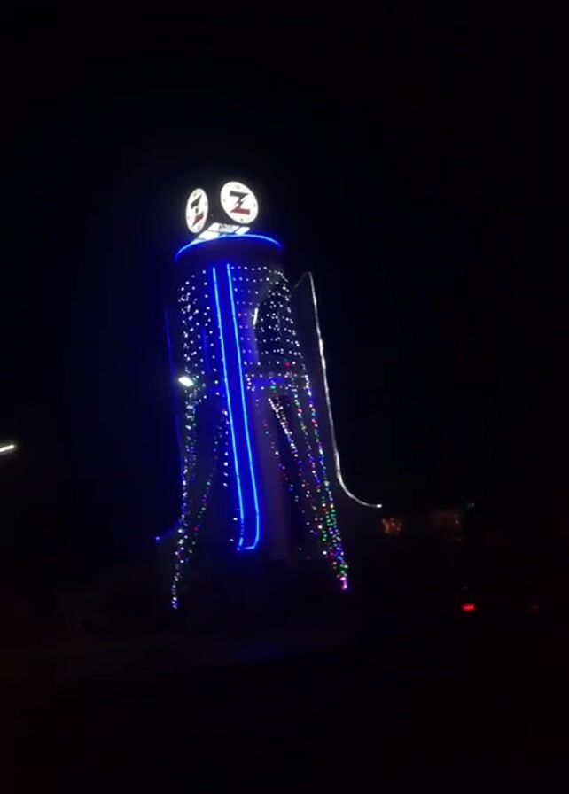 tall, illuminated structure at night. The structure has a cylindrical shape and is decorated with blue neon lights and strands of multicolored fairy lights. At the top of the structure are two circular signs with the letter "Z" on them. The background is dark, with only a few faint lights visible in the distance. A vehicle can be heard in the background.