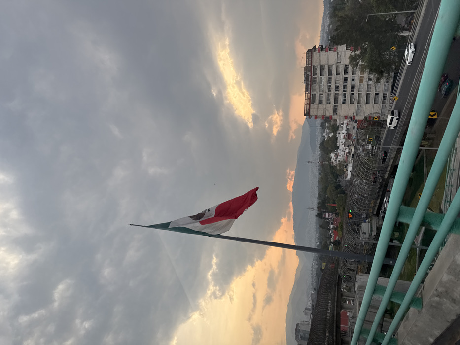 A Mexican flag waves against a cloudy sky with golden light. In the background is a cityscape with buildings, mountains, and a highway visible to the right. A green railing is in the foreground, on what appears to be a bridge or high vantage point. The scene evokes a sense of urban and national pride against a dramatic sky.