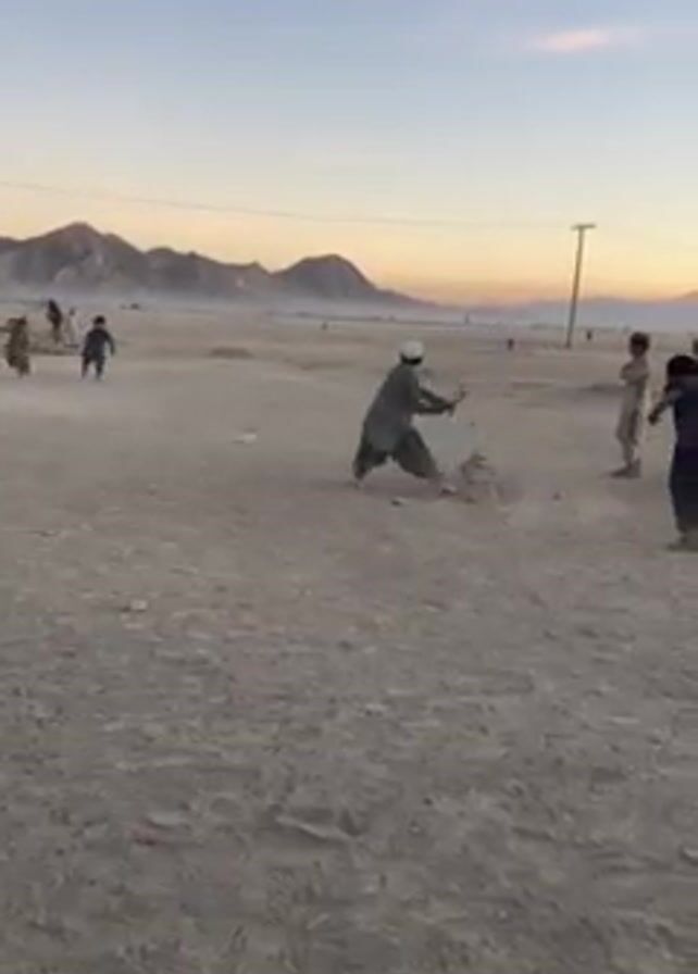The video depicts a group of people playing cricket in a dusty, open field. There are mountains in the background under a partly cloudy sky, and a utility pole is visible on the right. The field appears sparsely populated with scattered rocks and debris. Several individuals are wearing traditional Afghan clothing. One person is batting while others are fielding and watching the game.