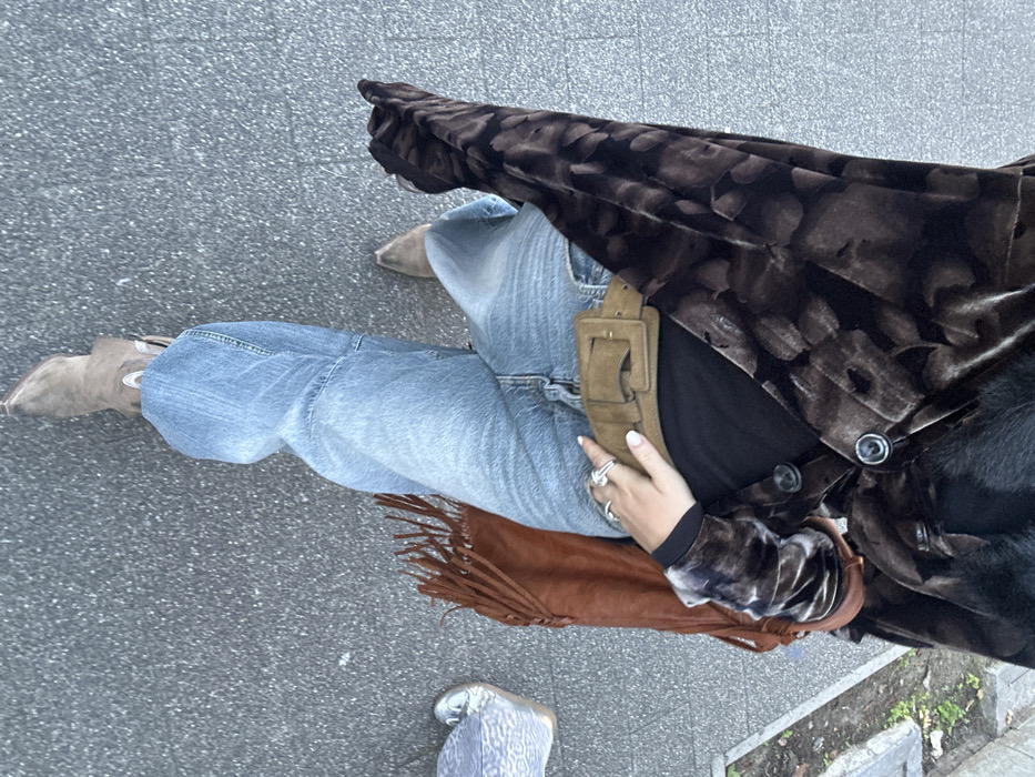 The image depicts an individual from the upper torso down, standing on a dark grey paved surface, understood to be in the city of Antwerp, Belgium. The subject wears a dark brown velvet jacket with a mottled pattern and large dark buttons over a black long-sleeved top. A wide, light brown suede-like belt with a large square buckle and integrated pouches cinches the waist. Light blue, wide-leg denim jeans cover the legs, and pointed-toe, taupe cowboy-style boots are worn on the feet. The individual's left hand, adorned with multiple silver-colored rings and white nail polish, rests on the belt. A rust-colored fringed bag or scarf hangs from the right side of the subject. To the right of the subject, a narrow strip of sparse green vegetation and a curb are visible, along with the toe of a silver-colored shoe, indicating the proximity of another person or object. The perspective is a high-angle, looking down at the subject and the immediate ground environment.