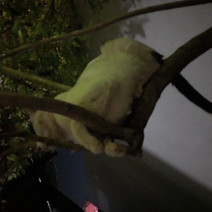 An off-white or cream-colored domestic cat is observed resting horizontally on a tree branch. Its front paws are visible, gripping the branch, while its head is partially obscured by vertical tree limbs. The cat's body is draped over the primary horizontal branch, with its hindquarters and part of its tail visible towards the right. Green foliage is present in the blurred background, suggesting a leafy tree. A dark, possibly architectural, structure is partially visible in the upper left background, and a lighter, indistinct surface occupies the lower background. The scene is illuminated by low light, indicating dusk or nighttime conditions in Tinaquillo, Venezuela.