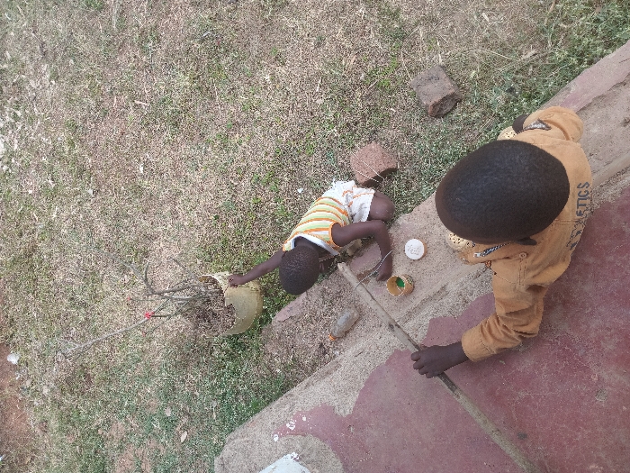 Two young children are playing outside on a concrete surface next to a grassy area. One child in a yellow shirt stands on the concrete holding a wooden stick. The other child, wearing a striped shirt, is near a broken pot containing branches. There are also small containers and a bottle scattered nearby. The surrounding area is a mix of dry grass, dirt, and brick fragments.