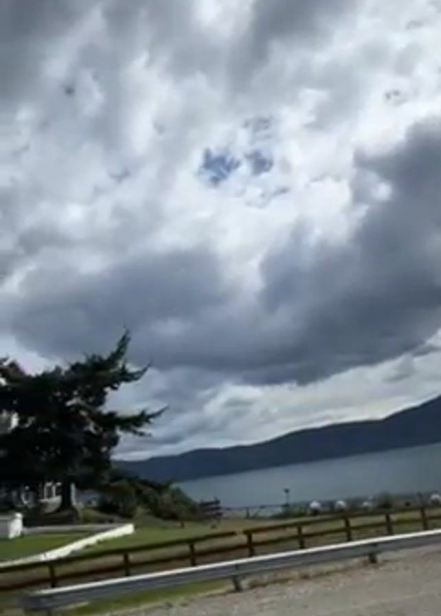 view from a vehicle moving along a road beside a body of water, possibly a lake or sea. Across the water, hills or mountains are visible in the distance. The sky is filled with dramatic, heavy clouds, though some patches of blue are visible. Beside the road, there is a grassy area with a wooden fence, a guardrail, and a few trees. As the vehicle progresses, a large building with a red roof becomes visible. The building appears to be a hotel or lodge. A smaller, stone building is visible nearby. Several cars are parked outside the main building. Power lines run above the road.