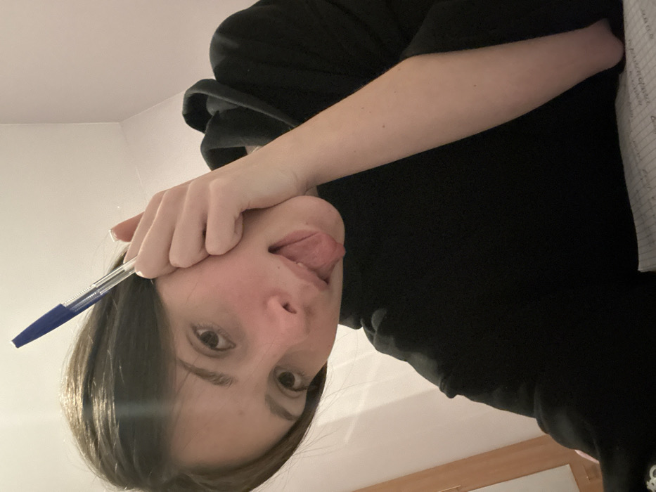 An upside-down selfie of a person with dark hair sticking their tongue out. They are holding a blue pen to their face. The person is wearing a black hooded sweatshirt and their arm is visible. A wall and a wooden panel are visible in the background. A notebook is partially visible in the upper right corner.