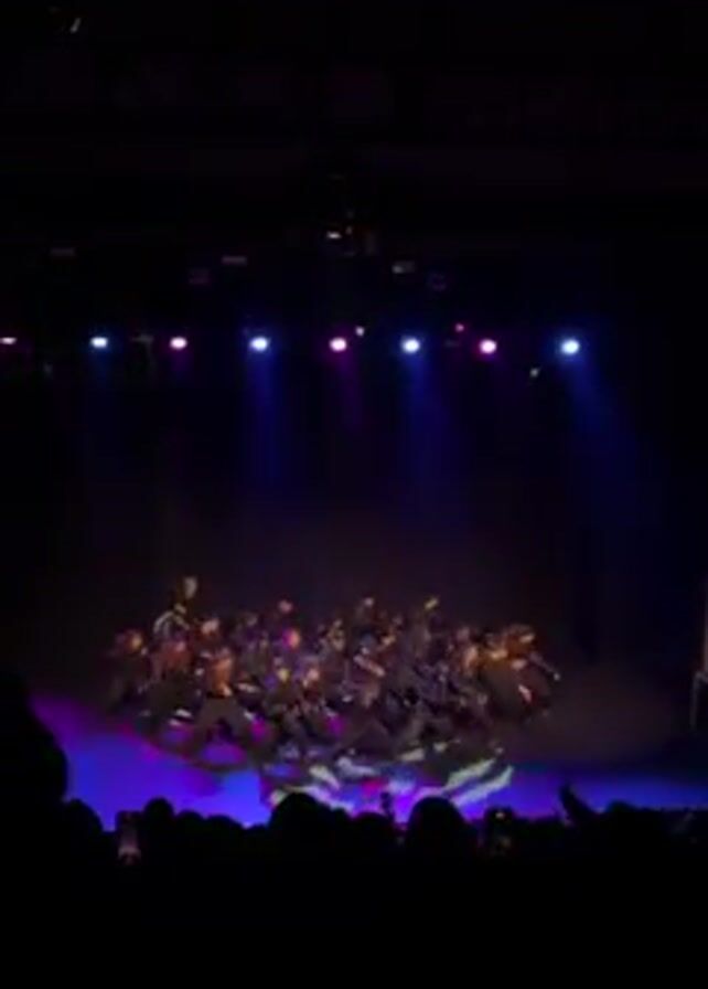 A large group of dancers perform on a stage illuminated by bright purple and blue spotlights. The stage floor is a circular shape with a pattern or design on it. The dancers, who appear to be mostly young, are wearing dark clothing, and their movements are synchronized. The stage backdrop is a dark curtain. The audience is visible in the foreground, silhouetted and holding up phones to record the performance. The venue appears to be a theater or auditorium.