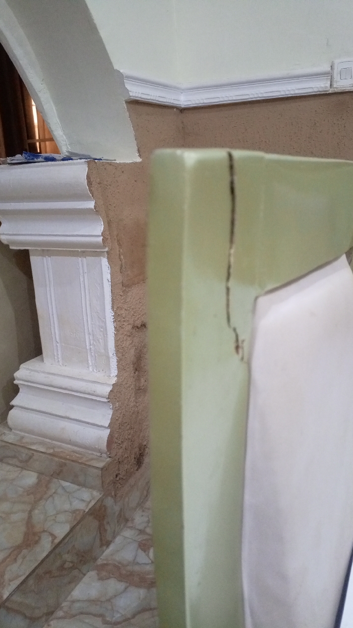 This image depicts an interior architectural scene, presumably within a building in the city of Unknown, Unknown. The foreground features a light green painted structural element, possibly a door jamb or wall corner, exhibiting a prominent vertical crack running down its center. To the left, a white classical-style pilaster base with vertical fluting and decorative molding stands on a polished, light brown and reddish-brown veined marble-tiled floor. This pilaster shows damage, with its white finish chipped away to reveal a textured, sandy-brown substrate material. Above the pilaster, a white archway or beam is also partially damaged, exposing the same brown substrate. The background reveals a light cream-colored wall meeting a white ceiling adorned with ornate white crown molding. A white electrical light switch or outlet is visible on the cream wall near the ceiling. To the far left, a brown-curtained window with visible vertical bars is partially visible through an opening. No individuals or active interactions are present in the scene, which generally indicates a state of disrepair or ongoing construction/renovation.