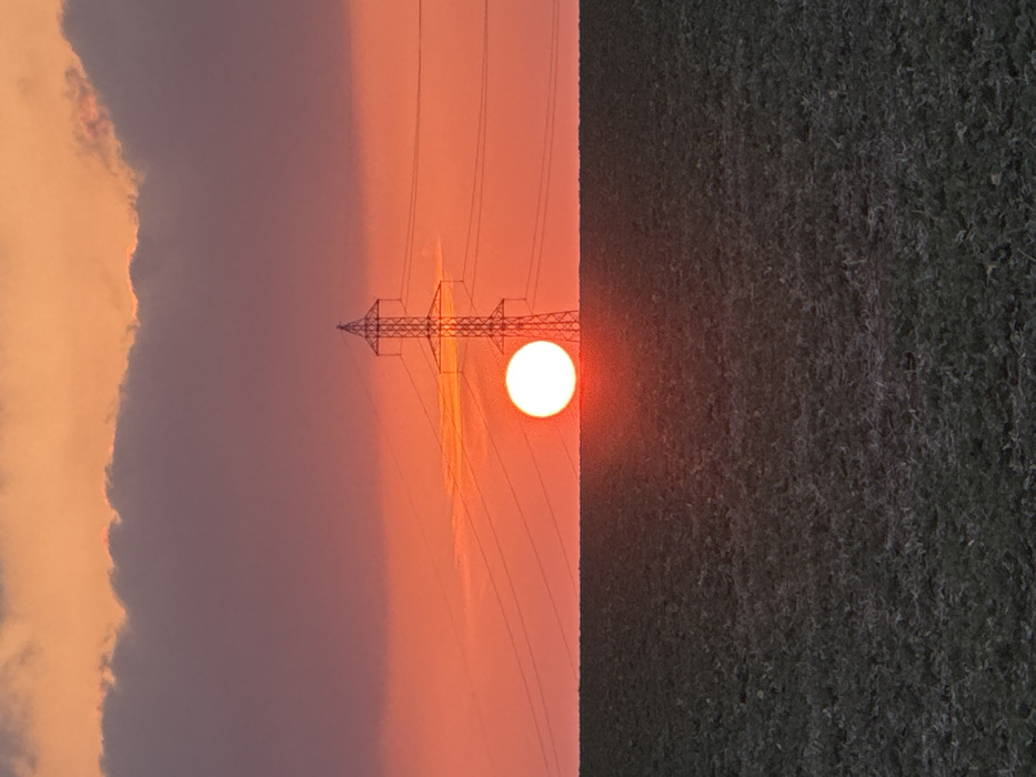 An outdoor, telephoto shot captures an agricultural field scene in Oreshak, Bulgaria, during either sunrise or sunset. The lower half of the image presents a dark, tilled field exhibiting textured soil. A sharp, horizontal horizon line divides the field from the sky. The sky is characterized by intense red and orange hues, with a horizontal band of darker grey-purple clouds situated across the upper portion. A prominent, brilliant white-yellow circular sun is partially visible just above the horizon, positioned slightly to the left of the image's vertical center. To the right of the sun, a tall, metal lattice-style electricity transmission tower stands in dark silhouette, with multiple power lines extending horizontally from its structure across the vibrant sky. No individuals, distinct actions, or interactions are depicted within the frame.