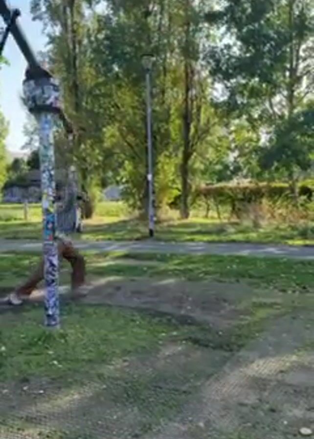 A man wearing a grey hoodie, brown pants, and shoes performs a hanging acrobatic stunt on a T-shaped outdoor gym apparatus. The apparatus consists of a horizontal bar with orange ends supported by a pole covered in stickers. The man swings up, hangs upside down with his legs extended, and balances. The surroundings include green grassy areas, trees, a walking path, and another pole in the distance. The weather appears sunny.