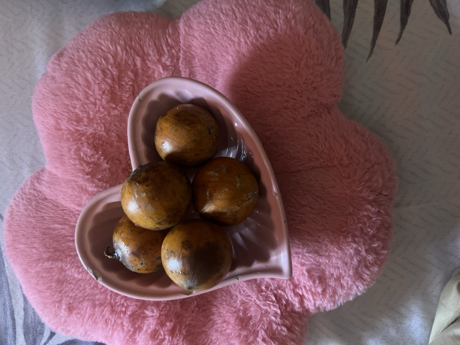This image depicts a still-life arrangement positioned in an unspecified indoor setting within the city of Dutse, Nigeria. The central subject is a light pink, heart-shaped ceramic bowl, approximately 15-20 cm in diameter, containing five round, yellowish-brown fruits. These fruits exhibit varied surface textures, including some darker blemishes or natural markings, consistent with the appearance of African Star Apples (Chrysophyllum albidum). One fruit, located at the top-left of the bowl, has a small, dried stem remnant. The ceramic bowl features a subtle fluted or ribbed design along its interior rim and shows a small chip or imperfection on its upper left edge. This bowl rests directly upon a plush, fluffy, bright pink object, which appears to be a decorative pillow or mat, shaped like a heart or flower. The pink fluffy item is placed over a light-colored fabric surface, likely a bedsheet, which displays a subtle textured pattern consisting of faint chevron or zig-zag lines and larger, abstract grey leaf-like motifs. The scene is illuminated by an indirect light source, casting soft shadows, particularly visible on the right side of the pink fluffy object. No individuals are present, and no actions or interactions are depicted.
