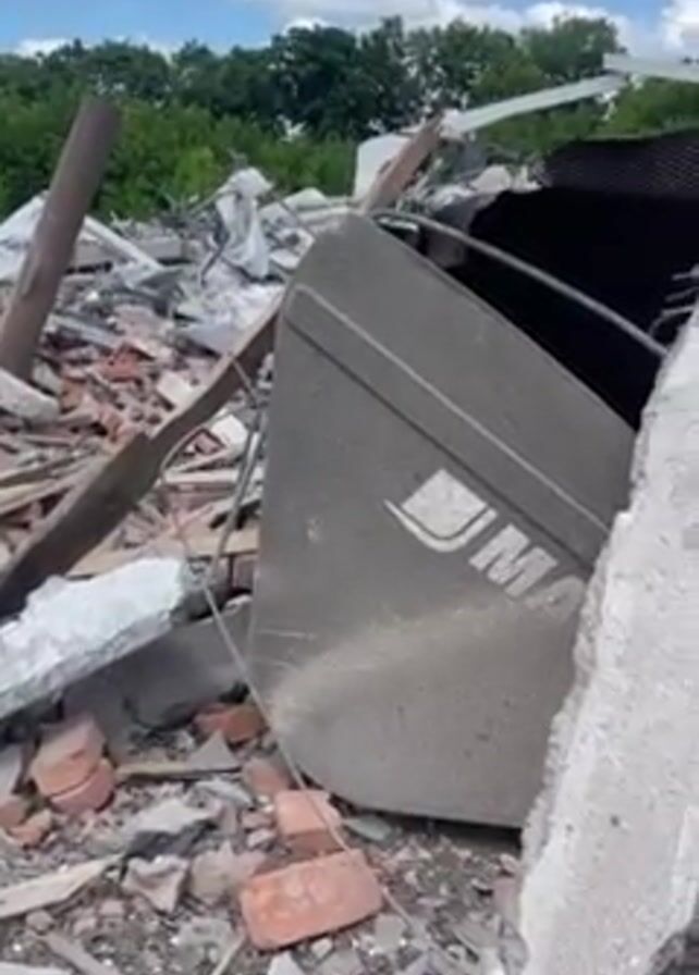 close-up of the debris of a destroyed building. The wreckage consists of broken bricks, chunks of concrete, metal scraps, and twisted pipes. A gray metal panel with the word "MAKITA" on it is visible among the debris. In the background, a treeline and a partial structure of a building can be seen against a blue sky with clouds. The scene suggests destruction and the aftermath of an event that caused significant structural damage. The camera remains still throughout the video.