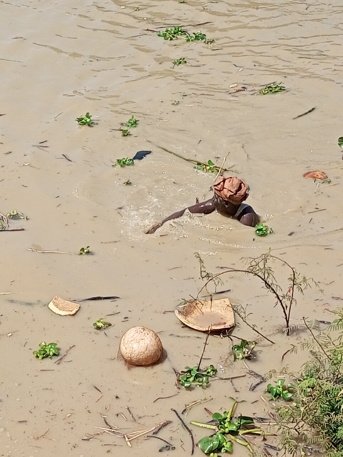 In Kokani North, Nigeria, a single individual is partially submerged in a body of turbid, brownish-grey water