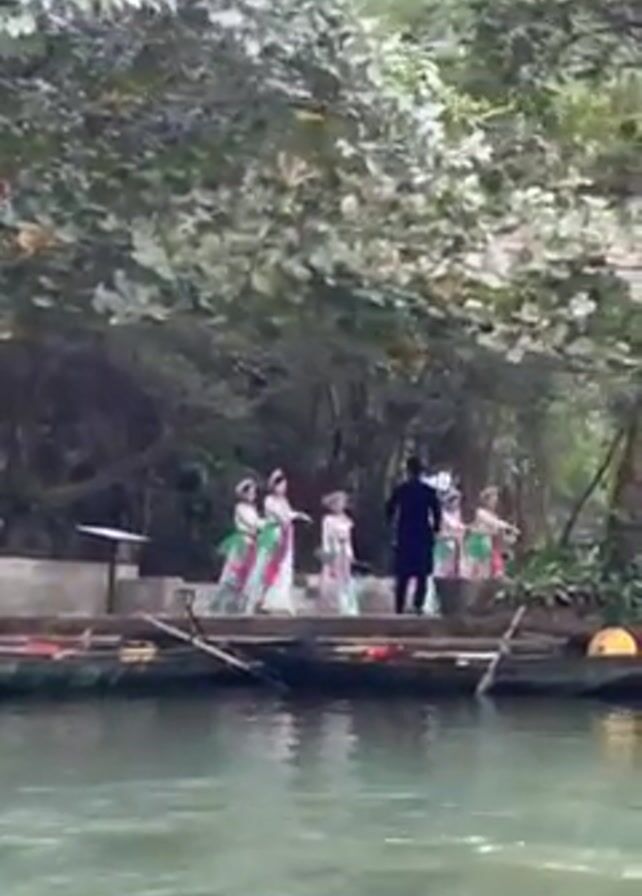 group of people on a small platform next to a river, likely performing some kind of traditional dance